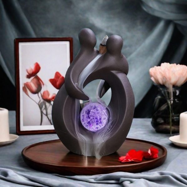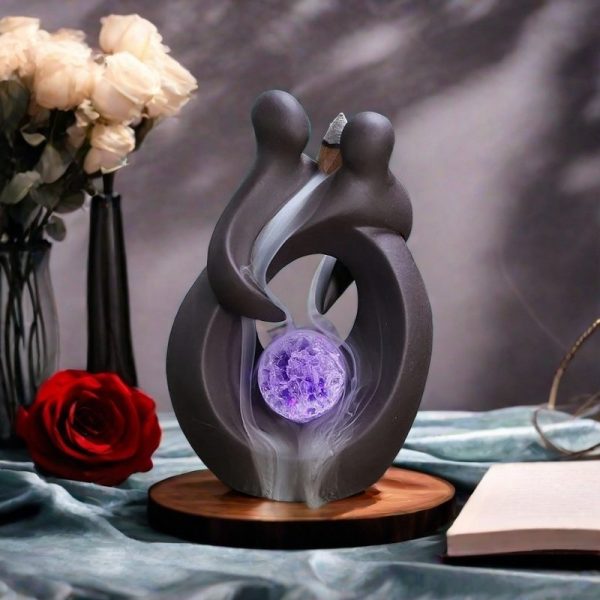 This exquisite piece, crafted from high-quality ceramic, is more than just an incense burner—it’s a statement of love and tranquility. The design features two lovers embracing, symbolizing unity and harmony, while the enchanting LED lights create a mesmerizing glow that highlights the cascading smoke, creating a waterfall effect that is both soothing and visually captivating. The smoke gently flows down, encircling the crystal ball at the base, enhancing the mystical ambiance of any room.